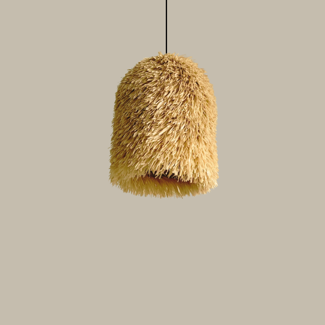 Hermosa lámpara elaborada con base de metal hecho a mano, tejida con fibra de palma.